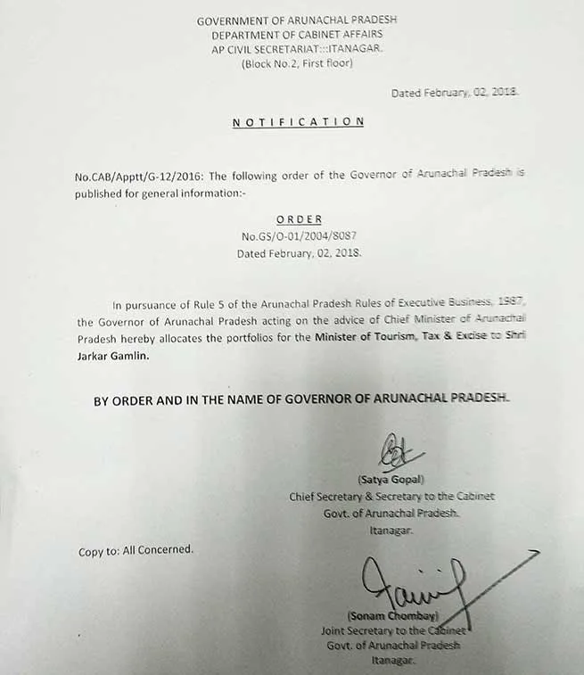 it was stated in the notification that the “Governor of Arunachal Pradesh acting on the advice of chief minister of Arunachal Pradesh hereby allocates the portfolios for the Minister of Tourism, Tax and Excise to shri Jarkar Gamlin”.