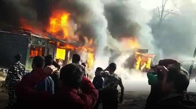 Atleast 13 commercial shops completely gutted and partially 6 in a massive fire mishap broke out today morning at Koloriang Market .
