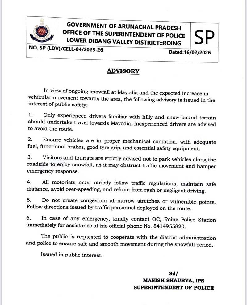 Amid ongoing snowfall and rising tourist movement, Lower Dibang Valley police released a fresh public advisory today urging motorists to follow safety protocols. Travellers were advised to avoid rash driving, ensure vehicle readiness and cooperate with traffic personnel deployed along the route.